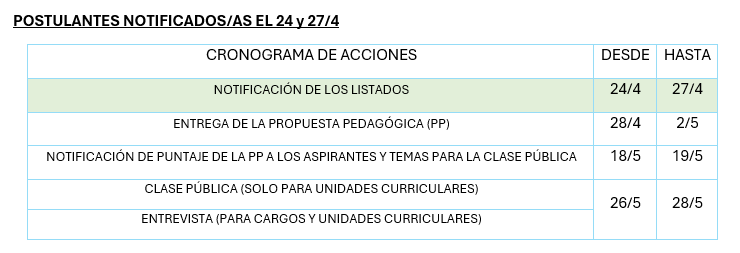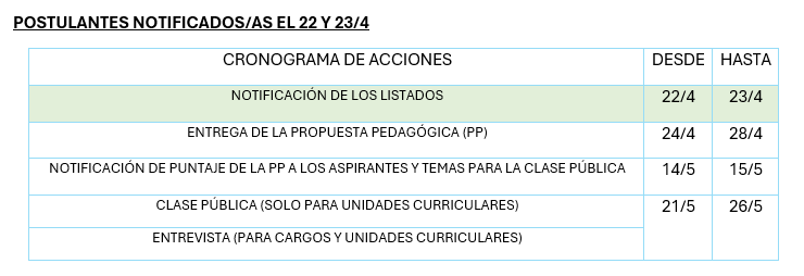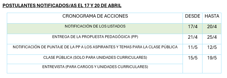 Estimados/as postulantes: en función de las modificaciones que se realizaron por las fechas de notificación de puntajes por antecedentes, cumplimos en compartir la rectificación de plazos para cada instancia restante de la convocatoria.